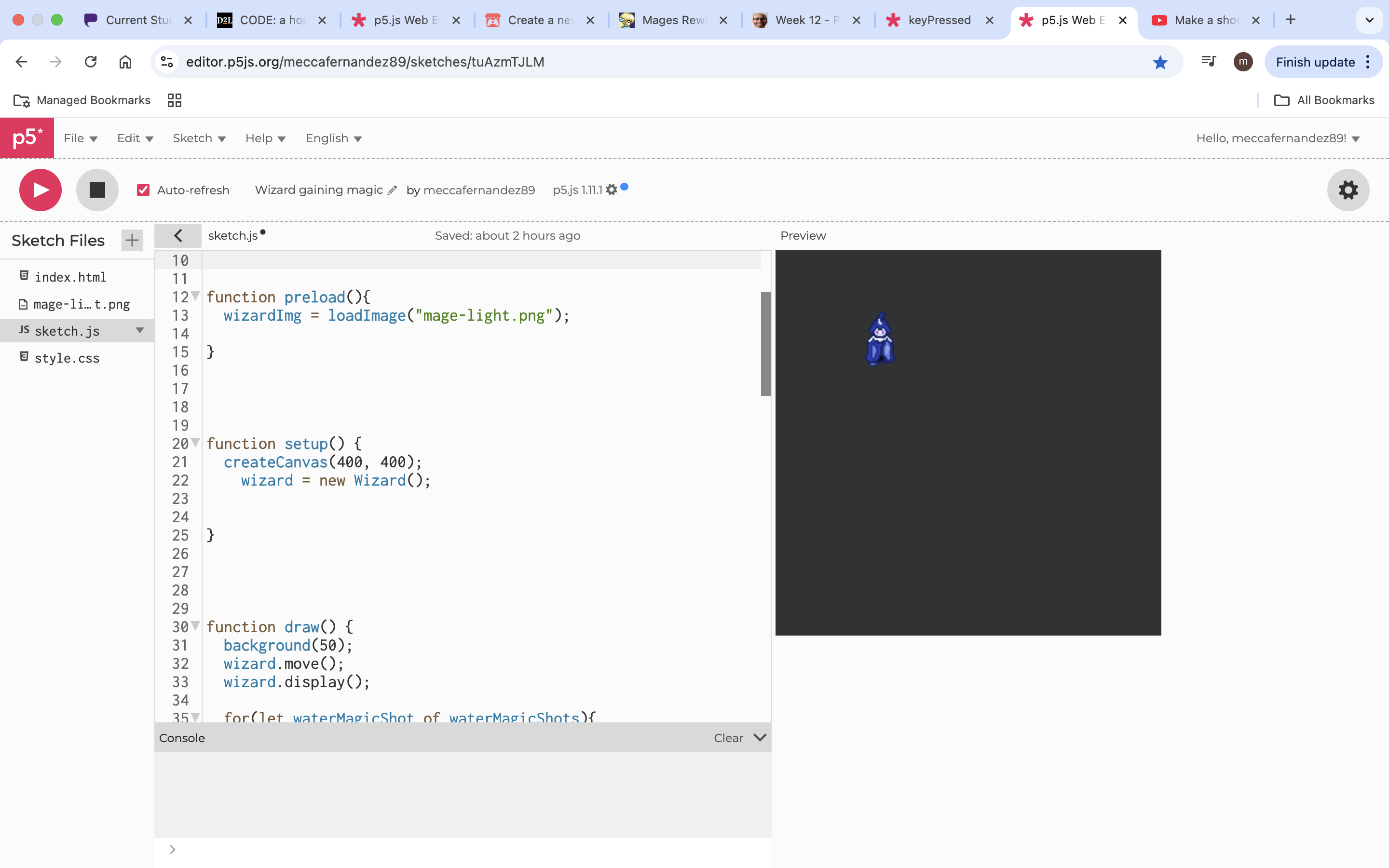 For the 9th Dev-Log, I decided to create a wizard magic shooter game where I wizard shoots magic energy as a projectile. The wizard sprite I used was created in public domain by an Author named Antum Delunge and it was also liscenced by Creative Commons Zero (CC0). I at first had trouble figuring out how to add the sprite image of the wizard into p5js however, I eventually figured out how to cut and trim the sprite image of the wizard that I wanted and imported it as well as displayed it on screen. Once I figured out how to import the image into P5js, the next move I tried to make was to get the sprite image to move using the key pressed functions. At first it was a little tricky to figure out however, as I read through my class notes and through demo codes that we went over in class I was able to figure out how to move the wizard back and forth on the screen. After I got the movement setup, I then tried to figure out how to add the duplicate versions of the wizard however, I got stuck trying to figure this process out so instead I decided to create a magic weapon called the water magic shot where the wizard will shoot water magic projectiles as you click the mouse constantly. This was such an awesome Dev-Log to make and it helped me better understand how to use the movement functions as well as how to create the water magic projectiles. Below is the code I used to create this mini project
